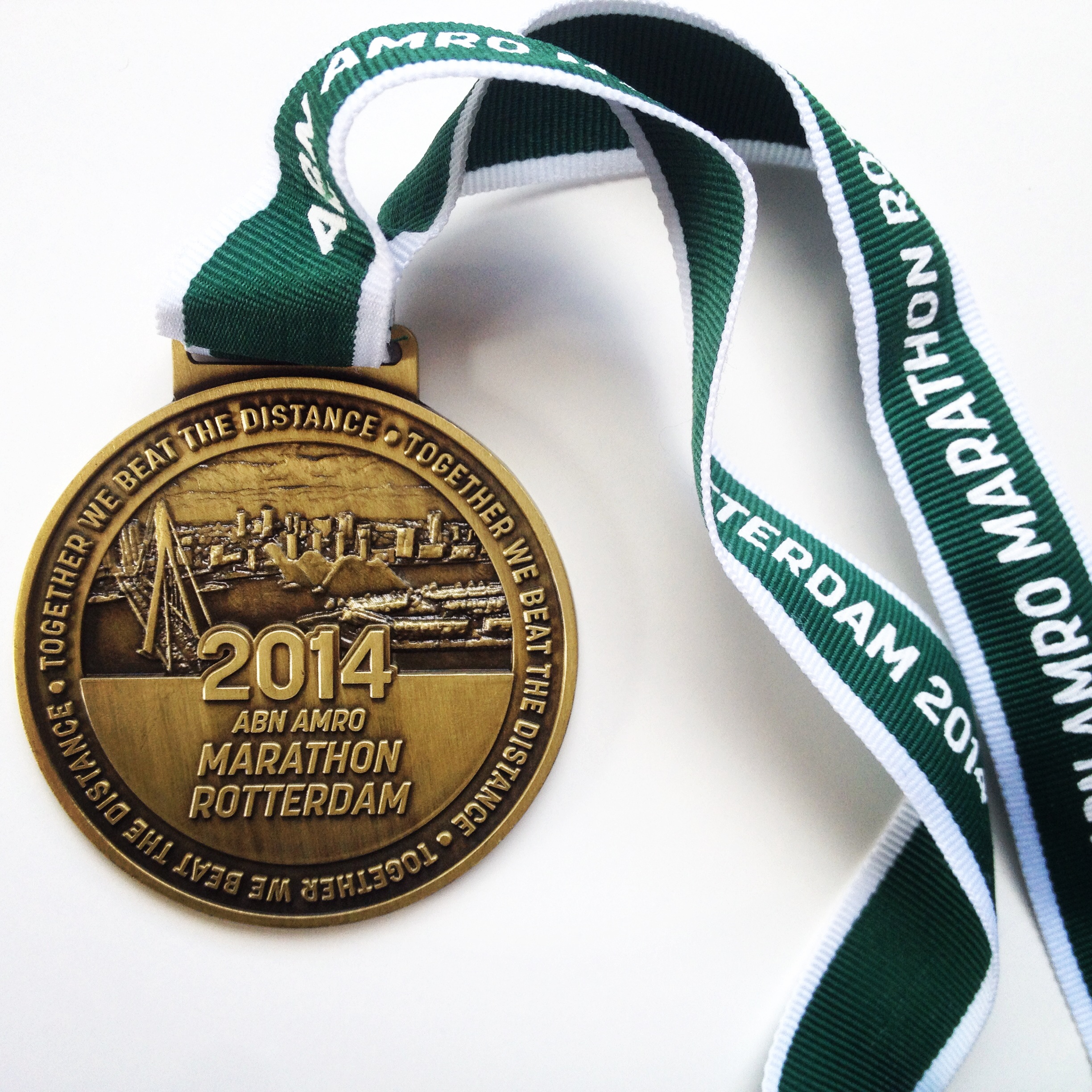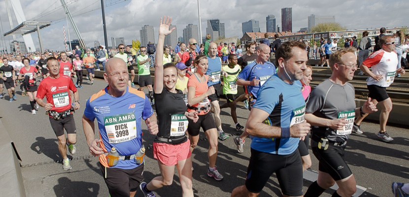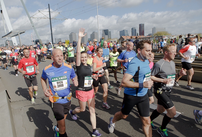 spandoekLee Towers zingt You’ll Never Walk Alone en dan hoor ik het kanonschot. We zijn weg. Niet te snel starten, niet te snel starten. Beginnersfout nummer één schiet wel honderd keer door mijn hoofd en voor ik het weet loop ik op de Erasmusbrug. Bovenop de brug staat mijn tante en op de weg naar beneden zie ik mijn ouders met dat geweldige lieve spandoek. Ik vlieg.