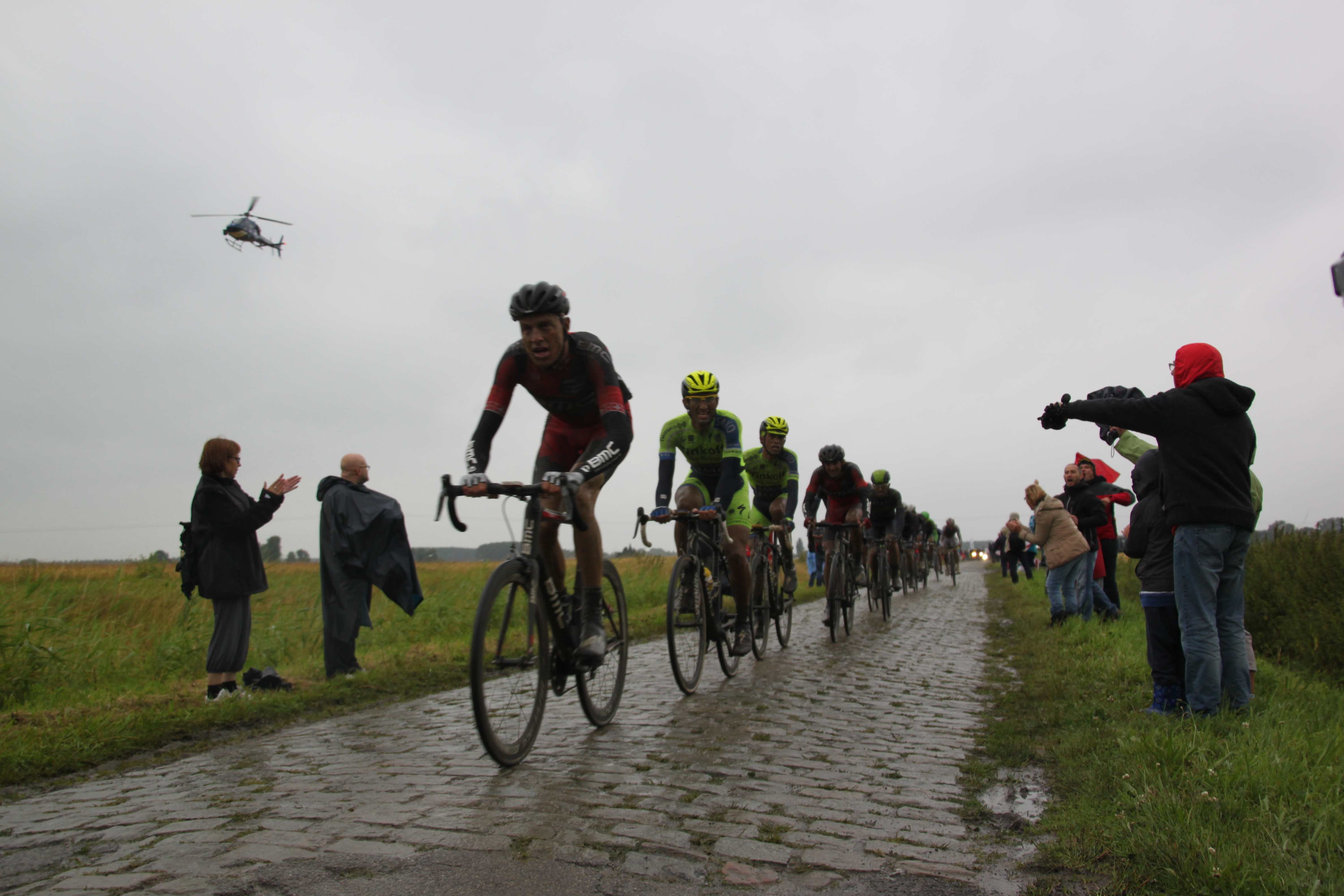 De risico’s zijn voor ieder weldenkend mens direct zichtbaar, maar tegelijkertijd is de charme van deze situatie zo mooi dat het voor elke sportliefhebber de ultieme manier is om zijn helden aan te moedigen. We staan op minder dan een meter afstand van de tourrenners. Om foto’s te maken zit ik op mijn hurken op de rand van de kasseienstrook met mijn voeten in de modder. Door de voorbij stormende motoren zit alles al snel onder de modderspatten. Omdat er op de kasseien niet altijd direct een ploegleiderswagen in de buurt is, staan de (voornamelijk Belgische toeschouwers) hier zelfs met reservewielen langs de kant van de weg. De fans maken letterlijk deel uit van de koers.