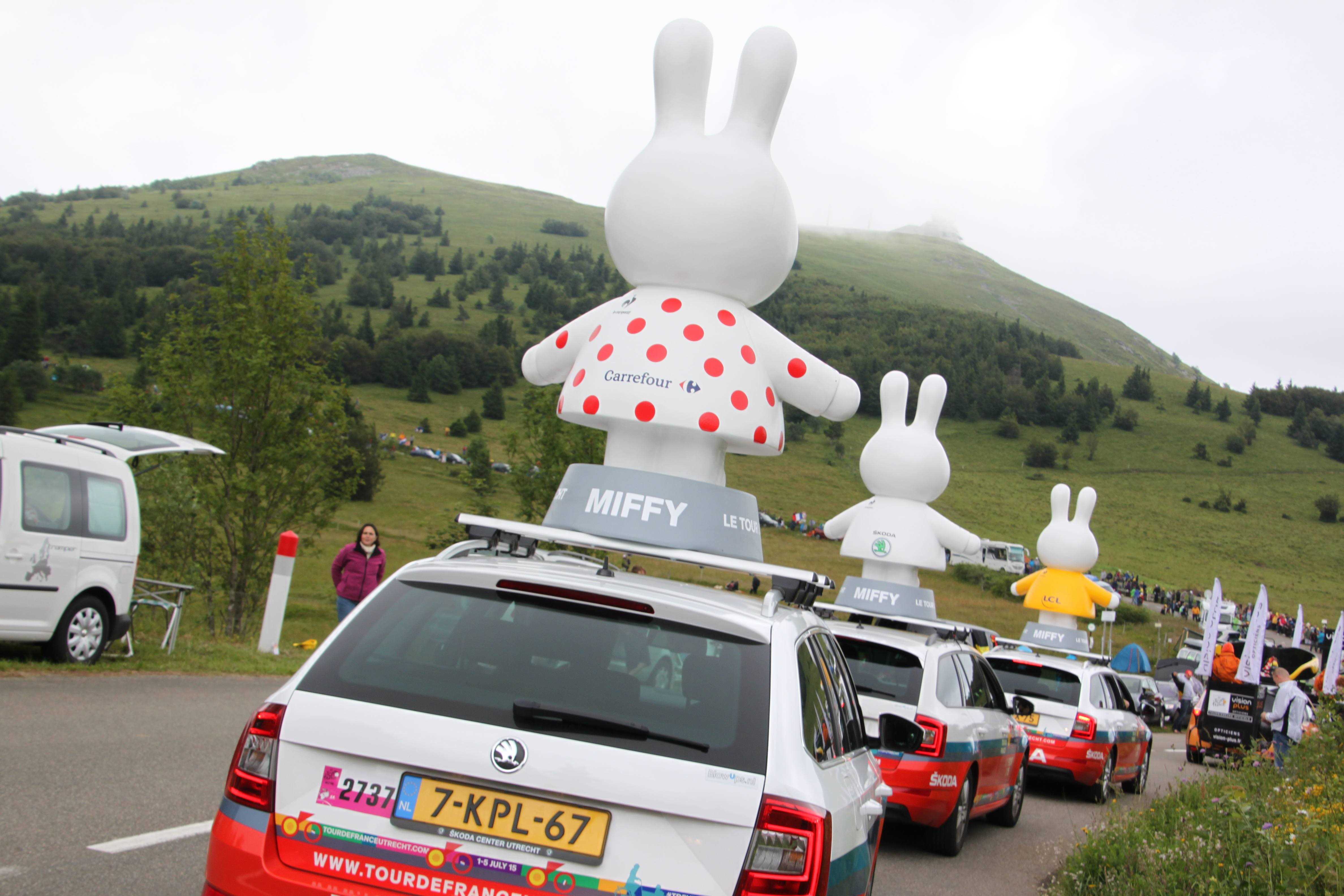 Ieder team heeft zijn vaste plek in de karavaan en moet die plek gedurende de hele etappe aanhouden. De karavaanwagens rijden om en om, zodat inhalende auto’s kunnen slalommen tussen de wagens door. Er mag nooit harder dan 70 km/u gereden worden en meestal ligt de snelheid veel lager. Alleen bij snelheden onder de 30 km/u mogen de caravaniers goodies uit het raam gooien en ook daarvoor heeft de A.S.O. instructies. Onze nijntje sleutelhangers moeten gegooid worden met een frisbee beweging en bij voorkeur over de mensen heen, zodat ze niet de weg op rennen.